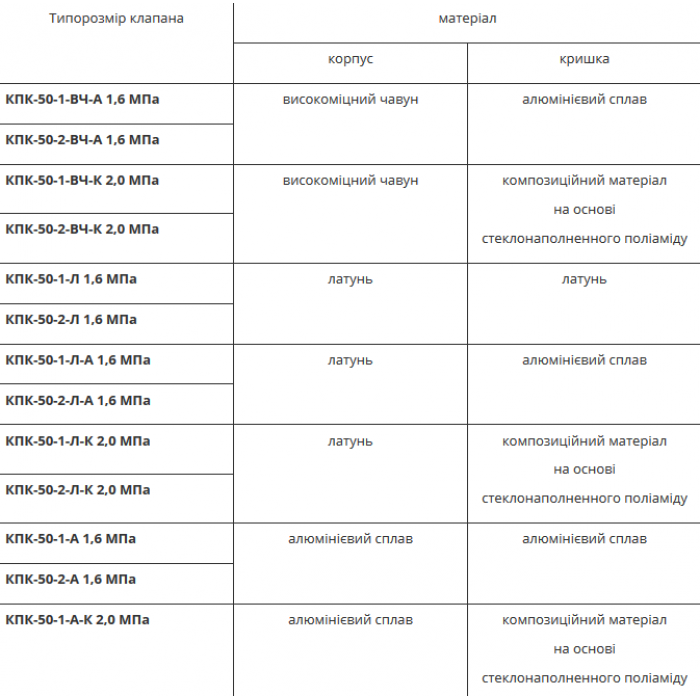 Корпусные детали клапана изготавливаются из высокопрочного чугуна, алюминиевого сплава, латуни и композиционного материала в зависимости от типоразмера.