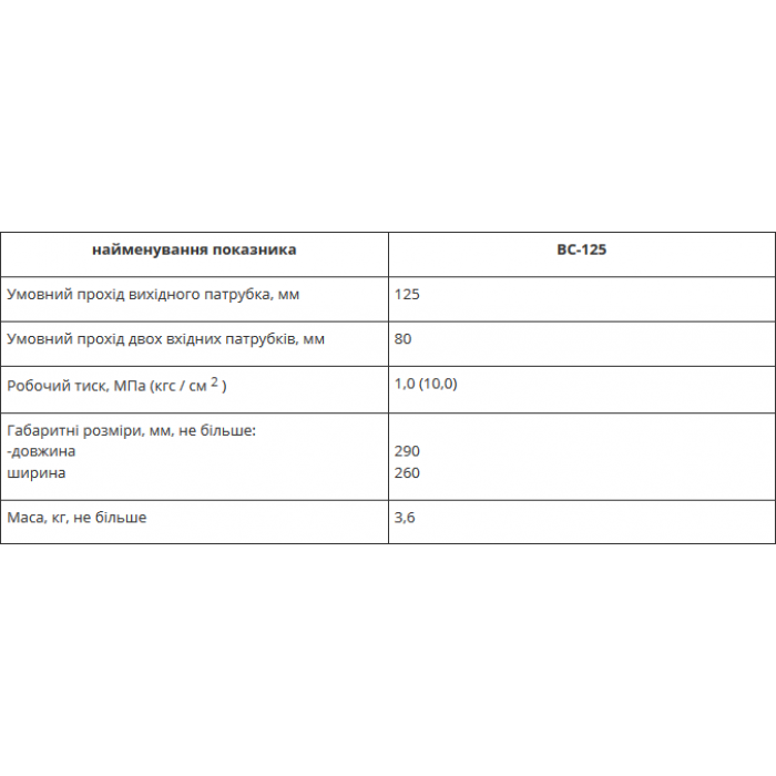 Водозбірник рукавний ВС-125 ДСТУ 2800-94 (ГОСТ 14279-95) призначений для збору води з двох пожежних рукавів та підведення її у пожежний насос. Входить в